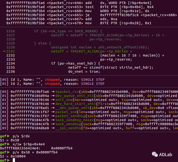 rdxÖдæ·Å×ÅTPACKET_ALIGN(tp_hdrlen+(maclen < 16 ? 16 : maclen))£¬£¬£¬£¬£¬£¬£¬¾ÞϸΪ0x50¡£¡£¡£¡£¡£¡£¡£rbp+0x4e4´¦´æ·Å×Åpo->tp_reserve£¬£¬£¬£¬£¬£¬£¬¾ÞϸΪ0x0000ffb4¡£¡£¡£¡£¡£¡£¡£Ïà¼Óºó£¬£¬£¬£¬£¬£¬£¬ÕûÊýÉÏÒçºó£¬£¬£¬£¬£¬£¬£¬rdxΪ0x0004¡£¡£¡£¡£¡£¡£¡£µ±Ö´Ðе½Ô½½ç»á¼ûʱ£¬£¬£¬£¬£¬£¬£¬ÏêϸÈçÏ£º