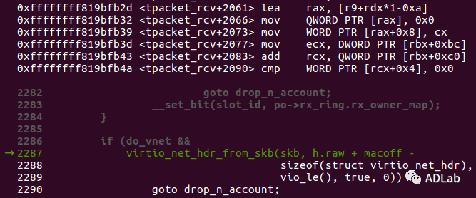 ÐÐ2287£¬£¬£¬£¬£¬£¬£¬Å²ÓÃvirtio_net_hdr_from_skb()º¯Êý´Ósk_buffÖп½±´Êý¾Ý£¬£¬£¬£¬£¬£¬£¬¸Ãº¯ÊýµÚ¶þ¸ö²ÎÊýΪh.raw + macoff ¨C sizeof(struct virtio_net_hdr)£¬£¬£¬£¬£¬£¬£¬h.rawΪtpacket_rcv_uhdrÀàÐ͵ÄÖ¸Õ룬£¬£¬£¬£¬£¬£¬Ö¸Ïò»·Ðλº³åÇøµÄframe£¬£¬£¬£¬£¬£¬£¬ÓÉÓÚmacoffÊǿɿص쬣¬£¬£¬£¬£¬£¬¿ÉÒÔÈÃmaoffСÓÚsizeof(struct virtio_net_hdr)£¬£¬£¬£¬£¬£¬£¬µ¼ÖÂÏòǰԽ½çд£¬£¬£¬£¬£¬£¬£¬×î¶à¿ÉдÈësizeof(struct virtio_net_hdr)¸ö×Ö½Ú¡£¡£¡£¡£¡£¡£¡£Æ¾Ö¤ÌṩµÄPoC£¬£¬£¬£¬£¬£¬£¬µ÷ÊÔ´úÂëÈçÏÂͼËùʾ£º