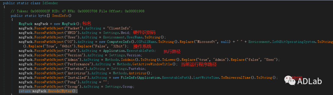 ľÂí³ÌÐòÔÚÓë¿ØÖÆ¶ËÅþÁ¬Àֳɺ󣬣¬£¬±ã×îÏÈŲÓÃ×Ô½ç˵ÀàÒªÁìIdSender.SendInfoÒªÁ죬£¬£¬ÍøÂçÊÜѬȾÖ÷»úºÍľÂí×ÔÉí°æ±¾µÈÏà¹ØÐÅÏ¢£¬£¬£¬ÕâЩÐÅÏ¢»á±»Öð¸öµÄÖü±£´æMsgPackÀàÖС£¡£¡£¡£¡£¡£»£»£»£»£»£»£»ñȡװ±¸ÐÅÏ¢´úÂëÈçͼ4-40Ëùʾ¡£¡£¡£¡£¡£¡£